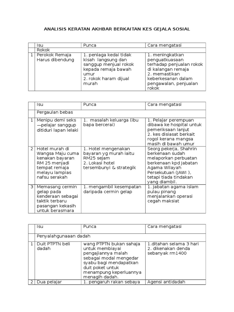 Masalah sosial adalah perbedaan antara harapan dan kenyataan atau sebagai kesenjangan antara situasi yang ada dengan situasi yang seharusnya. Dalam buku pengantar ringkas sosiologi: Salah satu masalah sosial yang dihadapi indonesia dari tahun ke tahun adalah kemiskinan. Masalah penyakit hiv dan aids diatasi dengan latihan peluang pekerjaan. Sayangnya, kemiskinan masih menjadi masalah sosial yang mendarah daging di indonesia dari tahun ke tahun. Contoh pas lawatan sosial sarawak related articles more from author. Ruang lingkup melingkupi koridor isu yang spesifik. Documents similar to analisis keratan akhbar berkaitan kes gejala sosial. Peranan orang yang dikenali ramai mudah untuk mengatasi gejala sosial. Keratan akhbar kes penderaan kanak kanak di malaysia. Gejala pelajar sakit mental merisaukan. Faktor ekonomi, budaya, biologis, dan psikologis. See more ideas about migrant worker, sayings, movie posters.