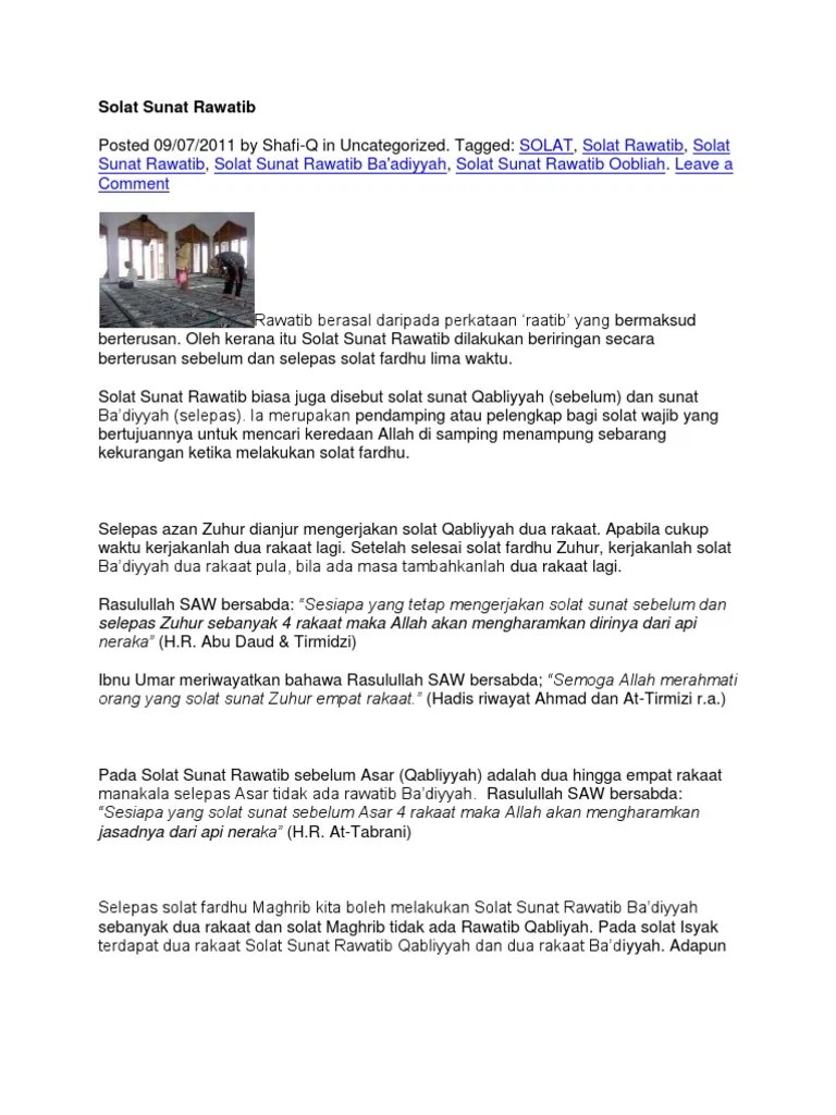 Aktiviti Harian Muslim from imgv2-1-f.scribdassets.com Cara solat sunat rawatib adalah seperti mengerjakan solat sunat 2 rakaat seperti biasa. Apakah hukumnya solat sunat selepas asar? Solat ini amat digalakkan oleh islam dan selalu diamalkan dan dilakukan oleh rasulullah s.a.w. Pada solat sunat rawatib sebelum asar (qabliyyah) adalah dua hingga empat rakaat manakala selepas asar tidak ada rawatib ba'diyyah. Solat dhuha sunat dilakukan di antara pukul 8 hingga 11 pagi. Dr asri bolehkah solat sunat setelah solat asar. 0⃣3⃣ 4 rakaat sebelum solat asar. Asalamualikum,sembhyang tahajud,hajat dan witir adakah kita melakukan dengan bacaan kuat ataupun seperti kita melakukan sembahyang zohor dan asar?mohon pencerahan saudara shafiq.terimakasih.